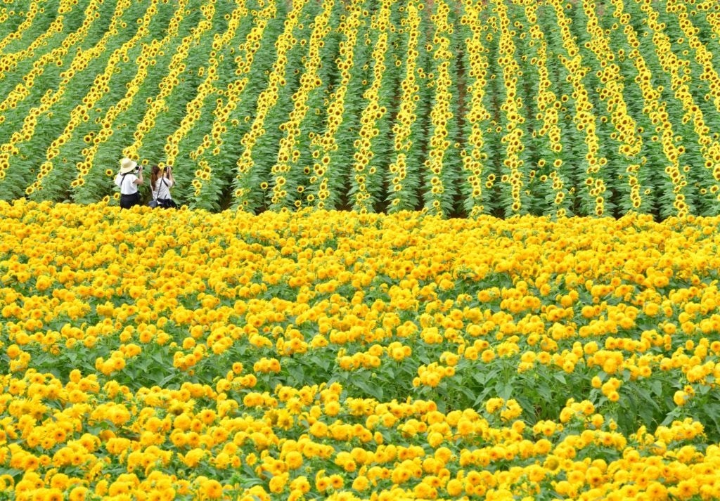 約10,000㎡もの畑を覆いつくすひまわりの群生。太陽のように輝くひまわりたちが畑一面に咲き広がります。王道の品種と八重咲き品種の両方をご覧いただける畑です。「みはらしの丘展望台」から見下ろせば、その広大な景色に思わず心奪われるでしょう。