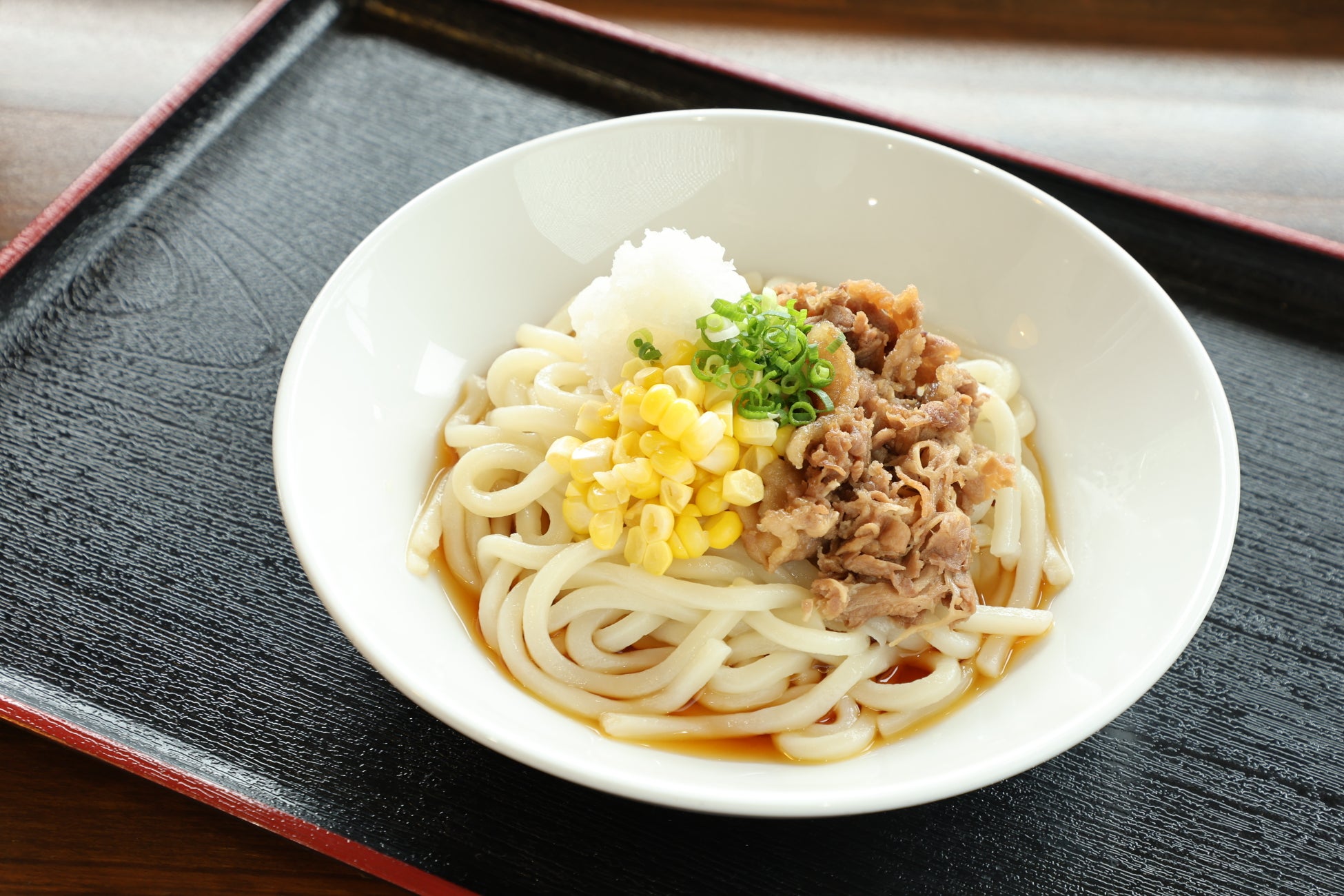 農場産とうもろこしがのった「冷やし肉うどん」。とうもろこしの甘みとお肉の旨味が食欲をそそります。お食事のほかかき氷もご用意しています。