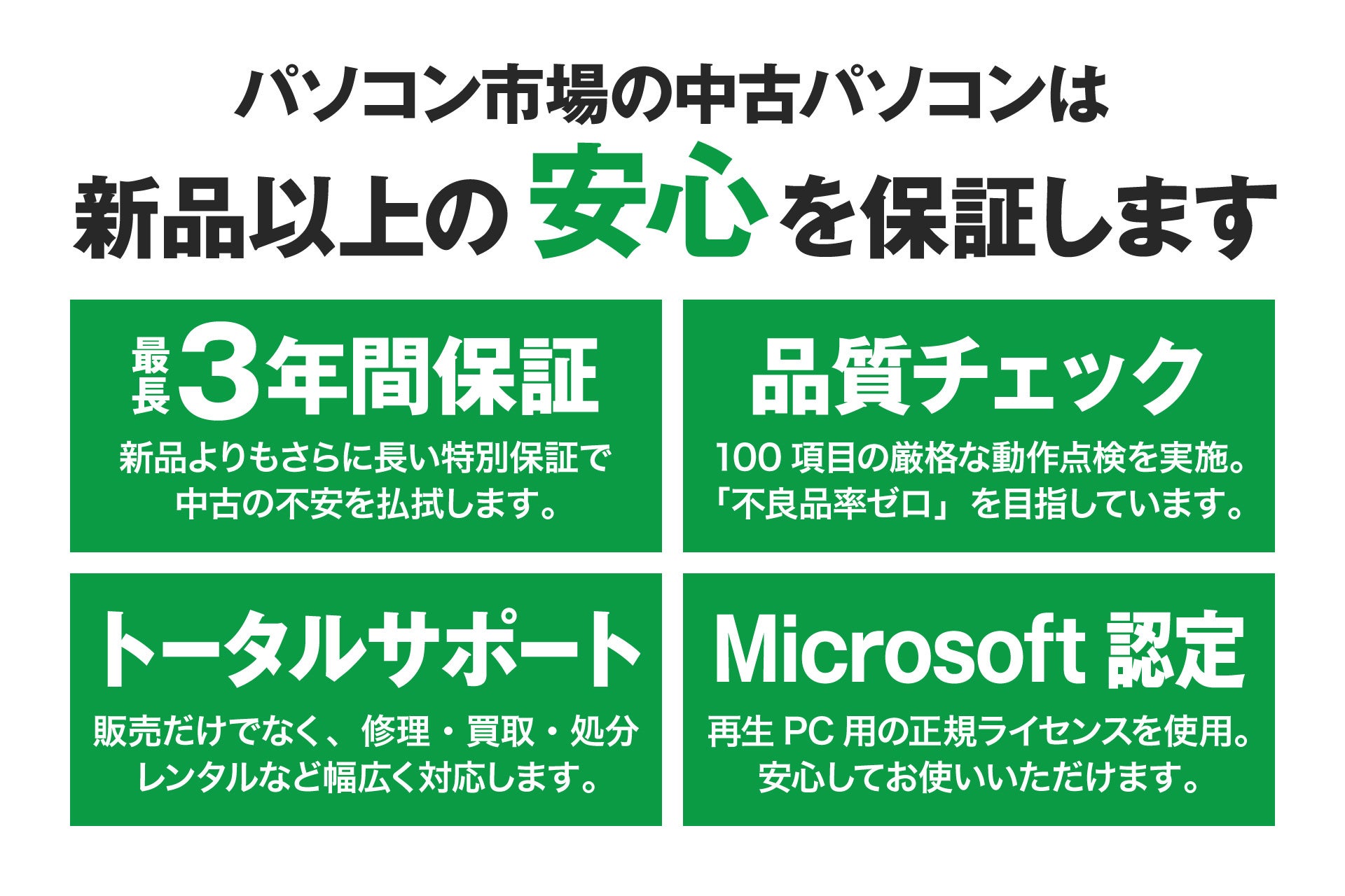 パソコン市場は、マイクロソフト社の厳しい基準をクリアした「マイクロソフト認定再生PC事業者(MAR)」です。正規のWindows OSを取り扱うことはもちろん、自社工場にて100項目以上の厳格な品質チェックと完全なデータ消去を行った、高品質な再生パソコンのみを提供しています。