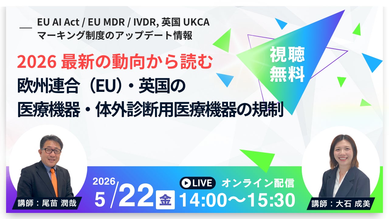 株式会社Berry(本社:東京都台東区、代表取締役:中野裕士)は、欧州連合(EU)および英国の医療機器規制の最新動向と、認証機関との付き合い方のコツを解説する無料オンラインセミナー「2026最新の動向から読む欧州連合(EU)・英国の医療機器・体外診断用医療機器の規制 〜EU AI Act / EU MDR / IVDR、英国UKCAマーキング制度のアップデート情報〜」を、2026年5月22日(金)14:00〜15:30に開催します。EU最大のノーティファイドボディであり、英国UKCAマーキング制度の主要アプルーブドボディでもあるBSI(英国規格協会)の日本法人・BSIグループジャパン株式会社より、尾苗潤哉氏と大石成美氏を講師に迎え、規制転換期における戦略的対応のポイントを、認証機関ならではの視点でわかりやすく解説いただきます。