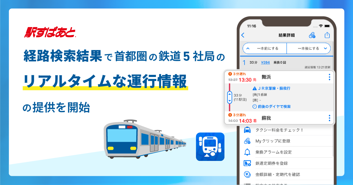 「駅すぱあとアプリ」、経路検索結果で首都圏の鉄道5社局のリアルタイムな運行情報の提供を開始