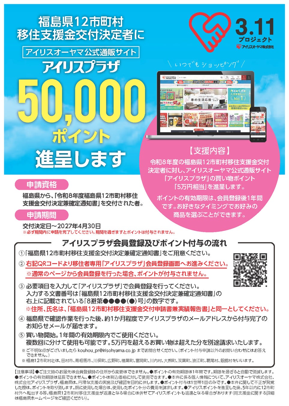福島県とアイリスオーヤマ株式会社は、2022年に12市町村の移住促進に係る協定を締結しました。交付決定者には上記支援金に加え、アイリスオーヤマ公式通販サイトで利用できるポイントを50,000ポイント進呈いたします。