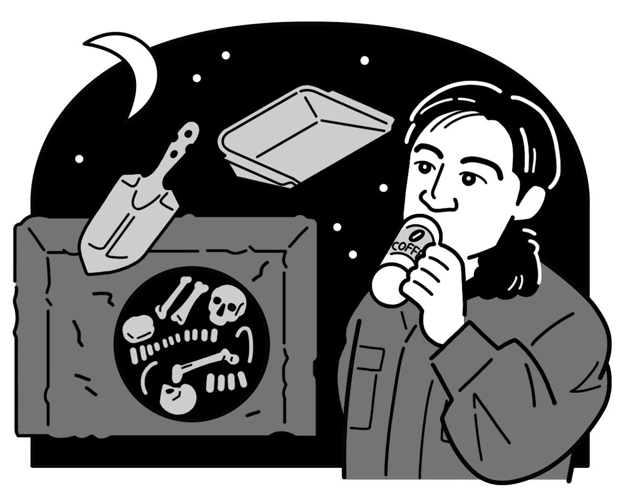 「一段落した調査現場で、私は温かい缶コーヒーを飲みながら考えた。誰が一体なんのためにこんな墓をつくったのだろうか。なぜ中妻貝塚につくられたのか。これだけの人骨はどこから運ばれてきたのか。以前より浮かんでは消えていた謎が、頭の中をぐるぐる巡る。」