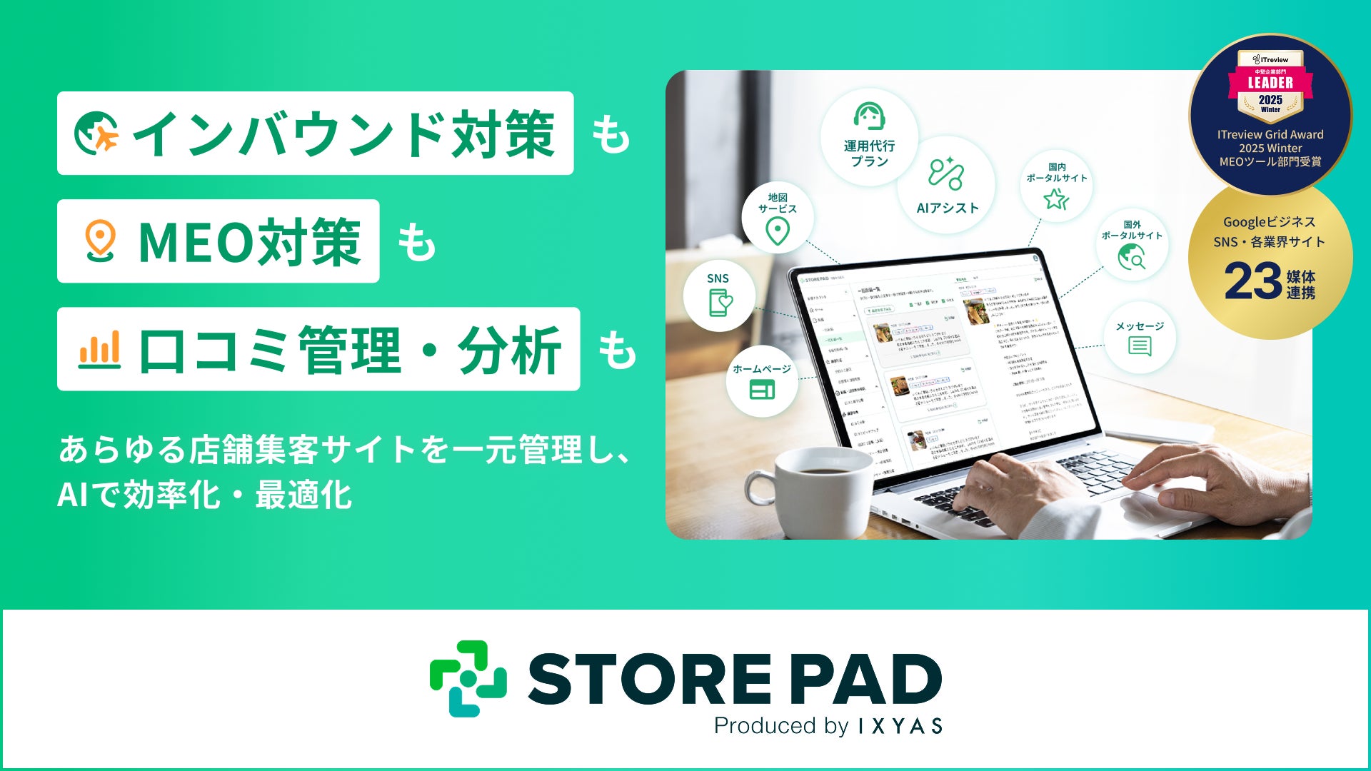 STOREPADは、23の国内事業者向け店舗集客メディアと連携する、店舗情報発信・分析プラットフォームです。地図アプリ・ポータルサイト・インバウンド向けメディア・SNS・HPなど様々な媒体への一括情報発信や口コミ分析で工数削減と集客向上、効果的なMEOを実現。店舗運営を成功に導きます。