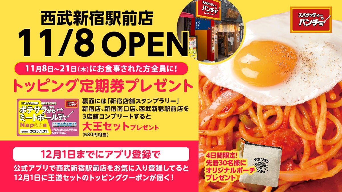 新宿3店目『スパゲッティーのパンチョ 西武新宿駅前店』が 11/8(金)に新規開店、トッピング定期券プレゼントや新宿店舗スタンプラリーなど4つのオープニングキャンペーンを開催