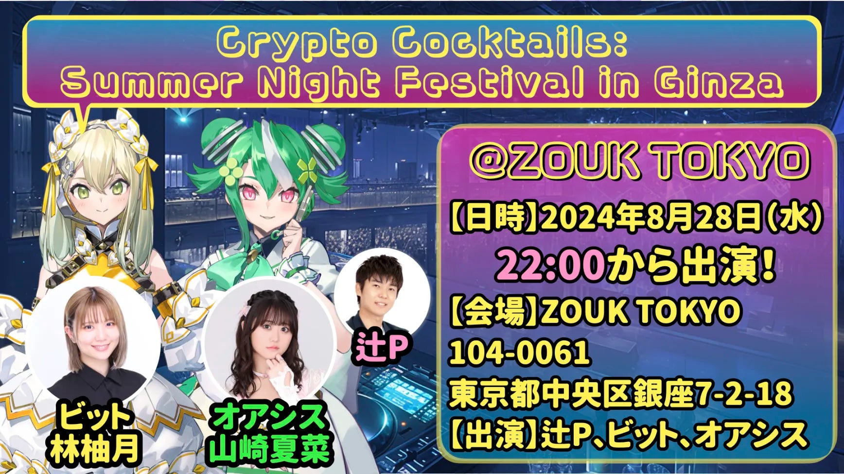 2024年7月上旬に京都で開催された Cocktail's Night の熱気をそのままに、Crypto Cocktailsは銀座の夜を盛り上げます!今回は夏祭りをテーマにした、より一層楽しいコンテンツでお届けします。