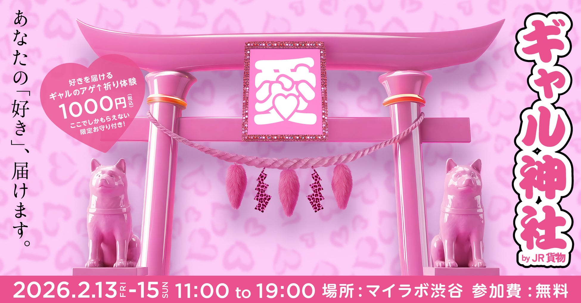 会場となるマイラボ渋谷には、ピンクの鳥居とデコミラーを設置したフォトスポット「ギャル神社本 殿」、恋や推し、自分自身へのエールを後押しする「愛のアゲ⤴みくじ」(無料)、そして、ギャル巫女が想いをまっすぐ受け止め祈りに変える「好きを届けるアゲ⤴祈り体験」(1,000円・お守り付)を用意。現代の若者が自分の気持ちと向き合い、それを"誰かに届ける"体験を、リアルな街の中にデザインします。