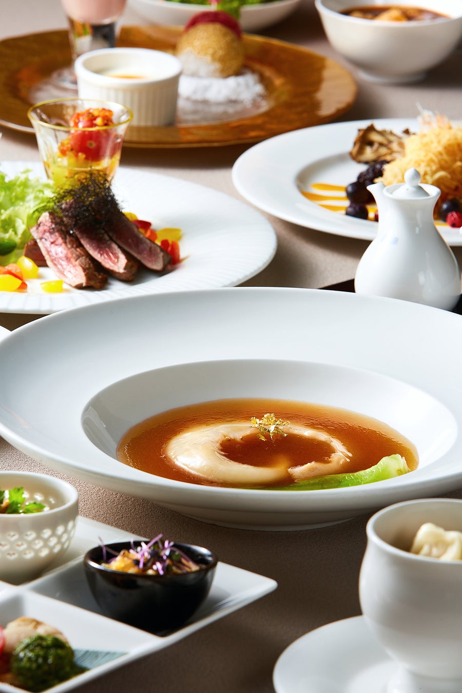 フカヒレの姿煮込みやズワイ蟹、牛背肉の煎り焼きなど、食欲を刺激する華やかな品々が勢揃い。