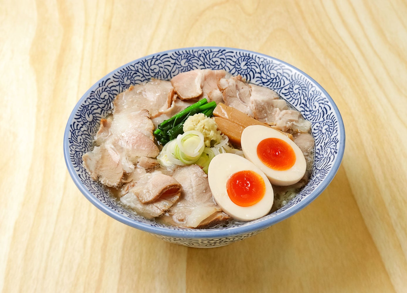 店内で丁寧に手作りした肩ロースのチャーシューと、特製メンマ、ホウレン草、ネギでシンプルに仕立て、おろし生姜をトッピングします。すりおろし生姜はお好みで足していただくこともできます。