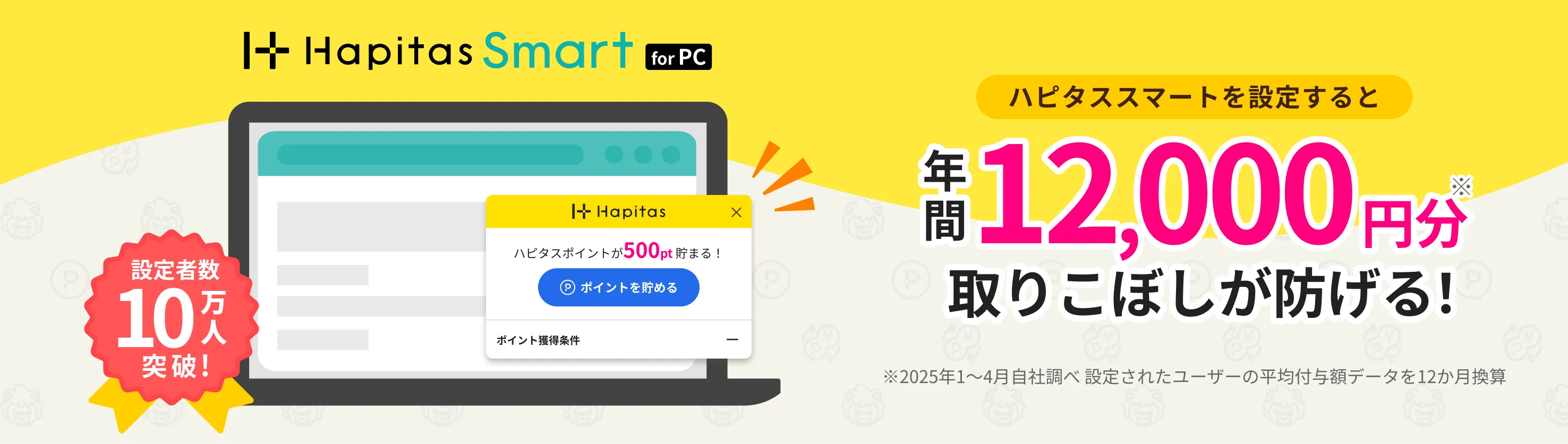 *³ 年間12,000円分の獲得ポイント平均値は、2025年1月〜4月に「ハピタススマート」を設定したユーザーの平均獲得額を12カ月換算したものです(自社調べ)。(1ポイント=1円換算)