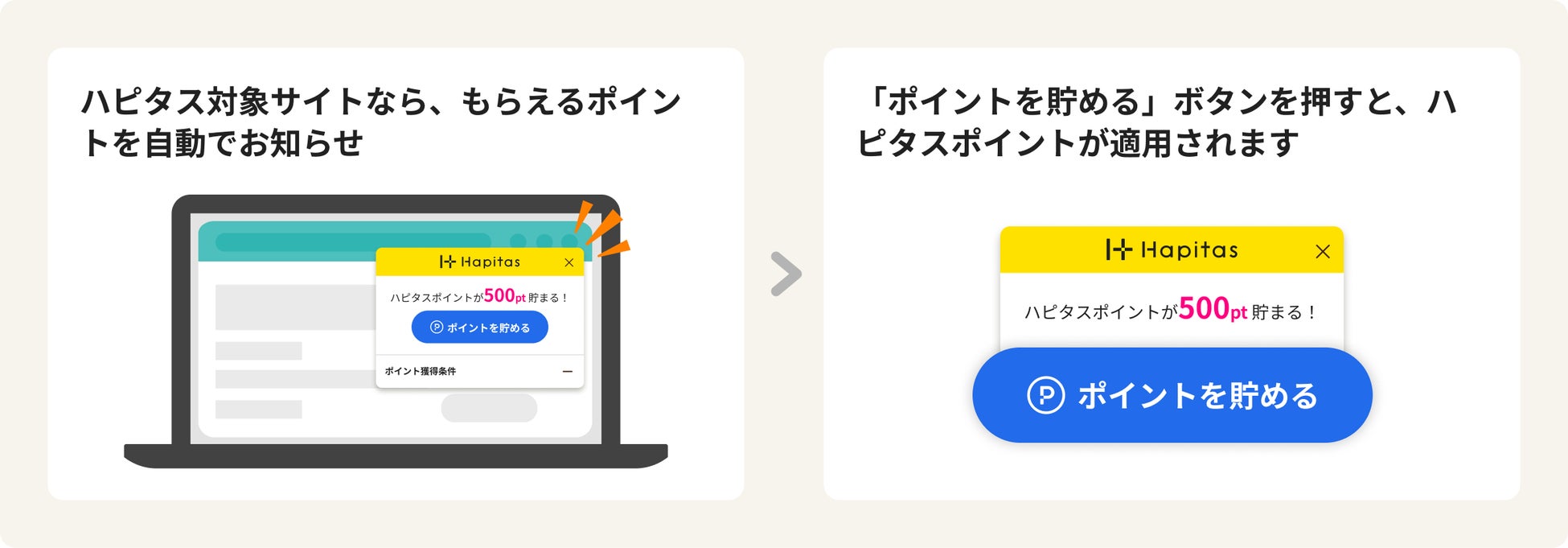 アクセスしたサイトが対象であれば自動でお知らせしてくれるため、お買い物やクレジットカード発行など、いつも通りWeb上でサービスを利用するだけで取りこぼしを防ぐことができます。