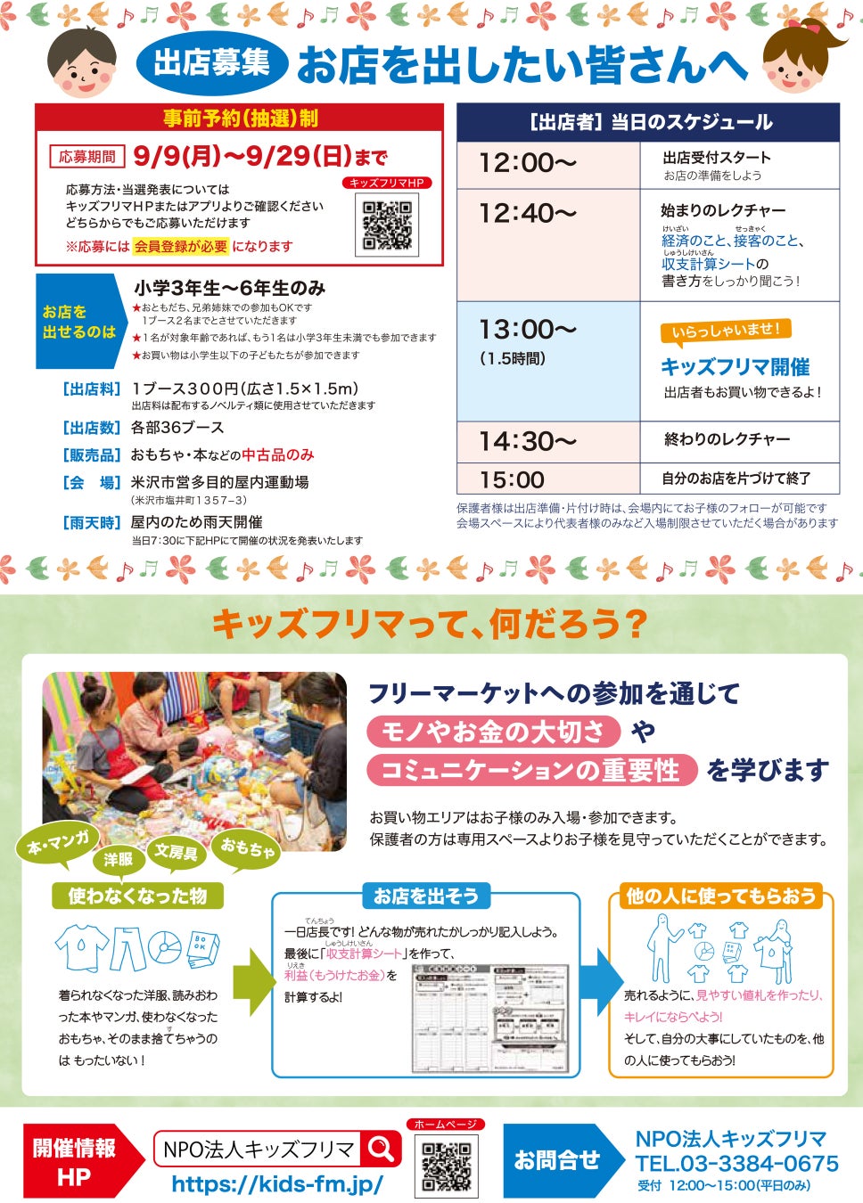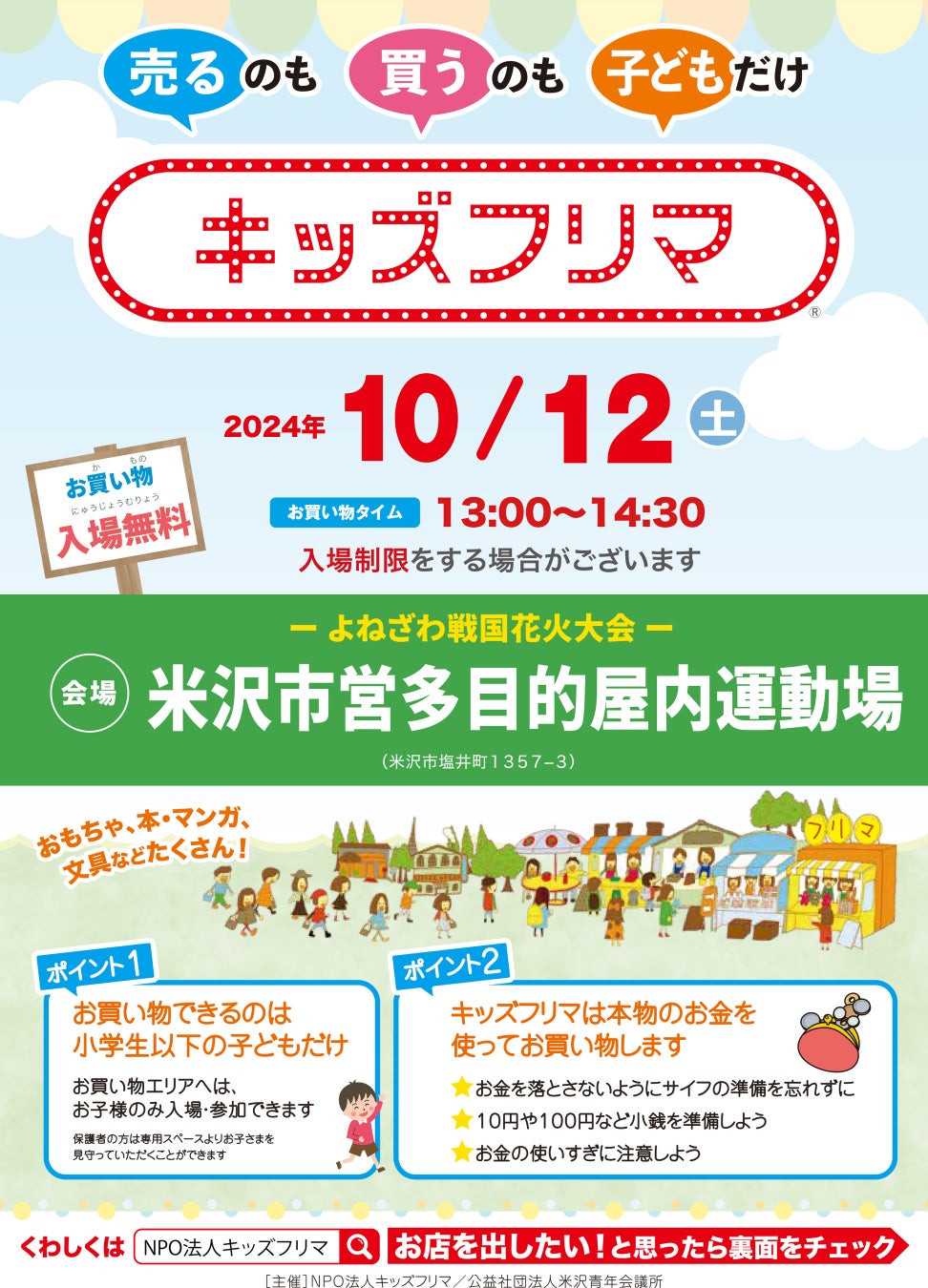 キッズフリマは、米沢市営多目的屋内運動場にて、13時〜14時30分に開催します。お店を出して商品を売るのも、買うのも子どもたちが行うフリーマーケットです。購買は現金で行うため、10円や100円硬貨をお持ちください。キッズフリマに出店できるのは小学3年生から6年生まで、出店は事前予約制となり、9/29(日)まで応募可能です。詳細はキッズフリマ公式サイトをご確認ください。