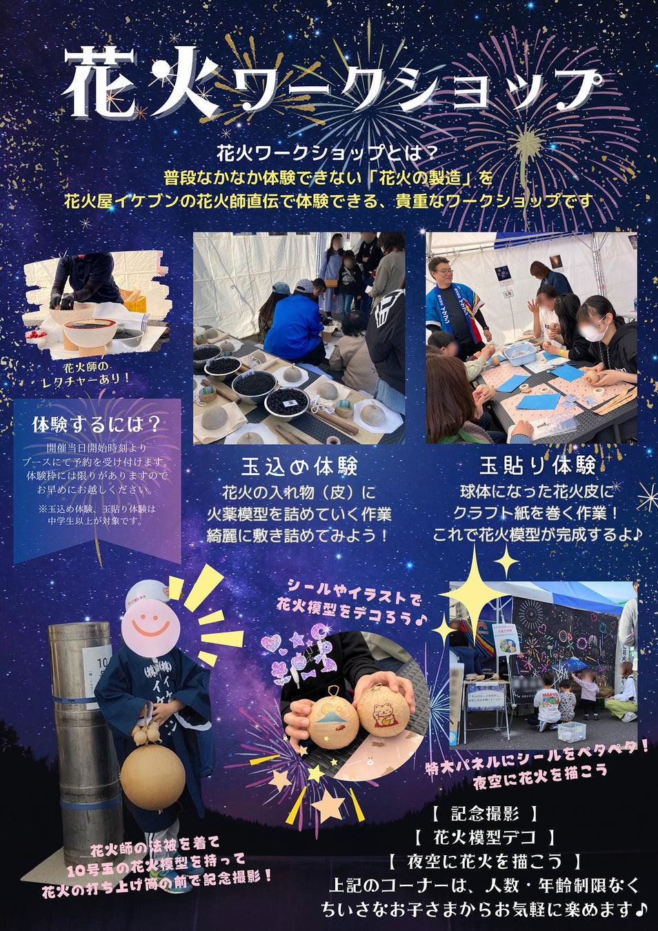 花火ワークショップは、10/12(土)13時〜17時に開催します。大曲花火競技会で内閣総理大臣賞を受賞し、100年以上の歴史を持つ煙火店「イケブン」の花火師による、花火の製造を体験できるワークショップです。