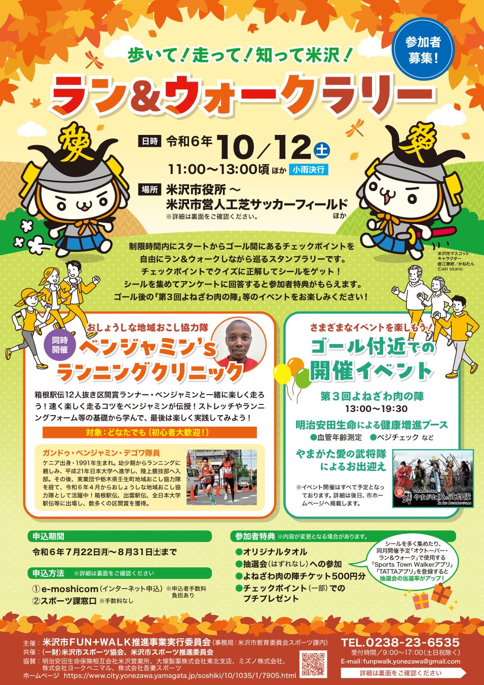 ラン&ウォークラリーは、米沢市営・人工芝サッカーフィールドをメイン会場として、11時〜13時に開催します。米沢市内を歩き、ランニングしながら、チェックポイントを巡りゴールを目指します。