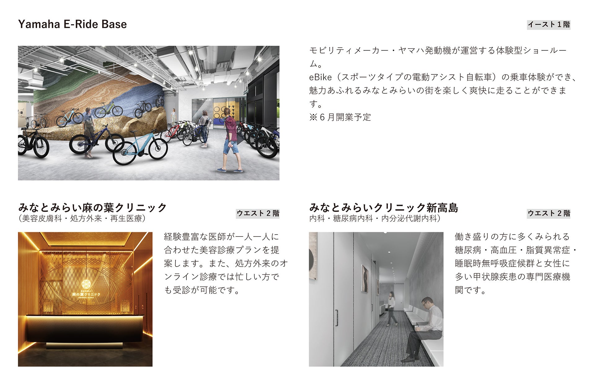 今後、低層部商業ゾーンとオープンイノベーションオフィス「chilink WORKSITE MINATOMIRAI」は2024 年5 月9 日、ヤマハの体験型「ブランドショップ」は2024 年6 月初旬、「京急 EX ホテル みなとみらい横浜」は2024 年6 月24 日に、順次開業します。