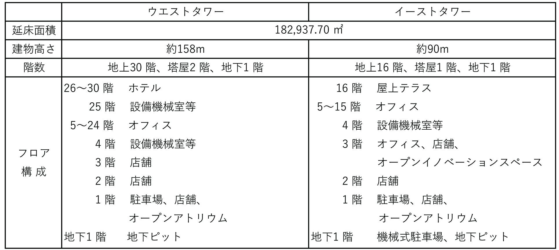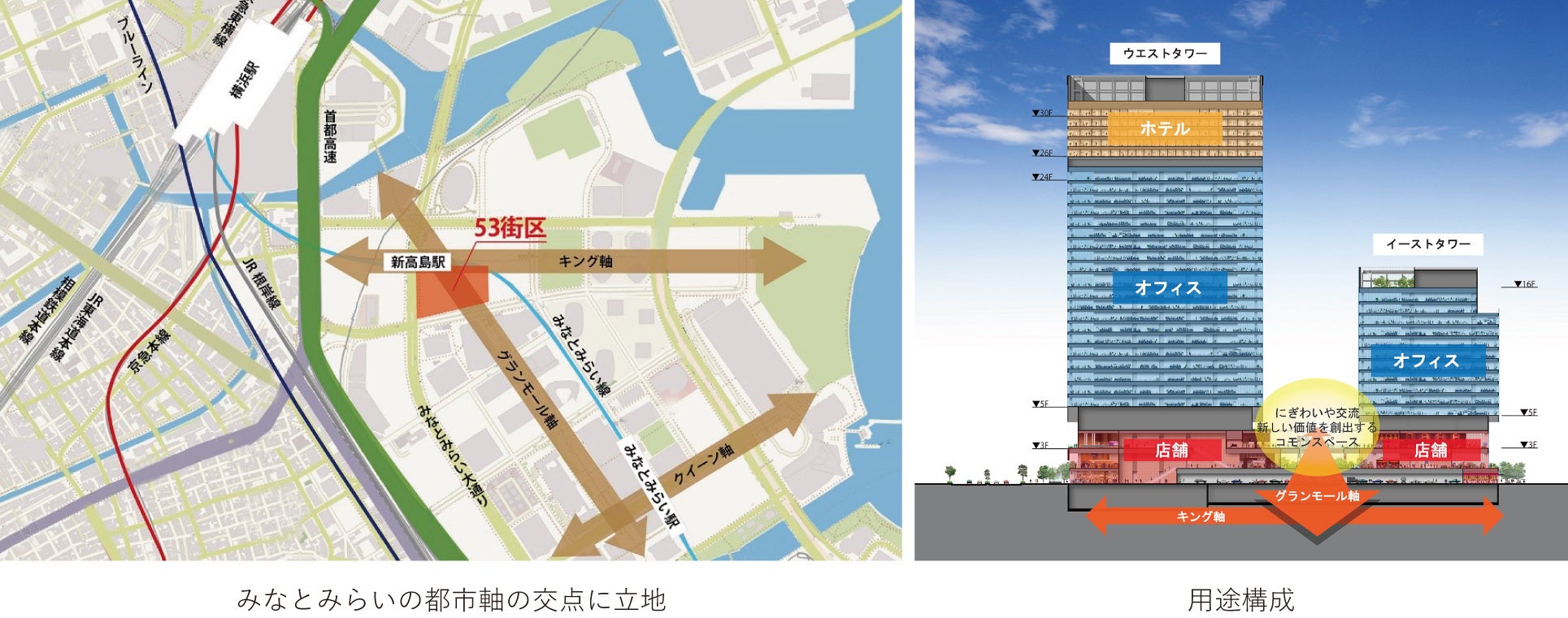 ウエストタワーは、基準階専有面積 約 3,360 ㎡を有するオフィスを主な用途とし、高層部は「京急 EXホテル みなとみらい横浜」、低層部はヤマハの体験型「ブランドショップ」や店舗で構成される多機能交流拠点です。イーストタワーは、基準階専有面積 約 2,820 ㎡を有し、さまざまな企業が本社や研究開発拠点として利用することを想定したオフィスを主な用途とし、低層部にはオープンイノベーションスペースや店舗を備えています。街区内には、開放的なコモンスペース(広場状空地)があり、来街者やオフィスワーカーにとっての憩いの環境や交流の場を提供します。