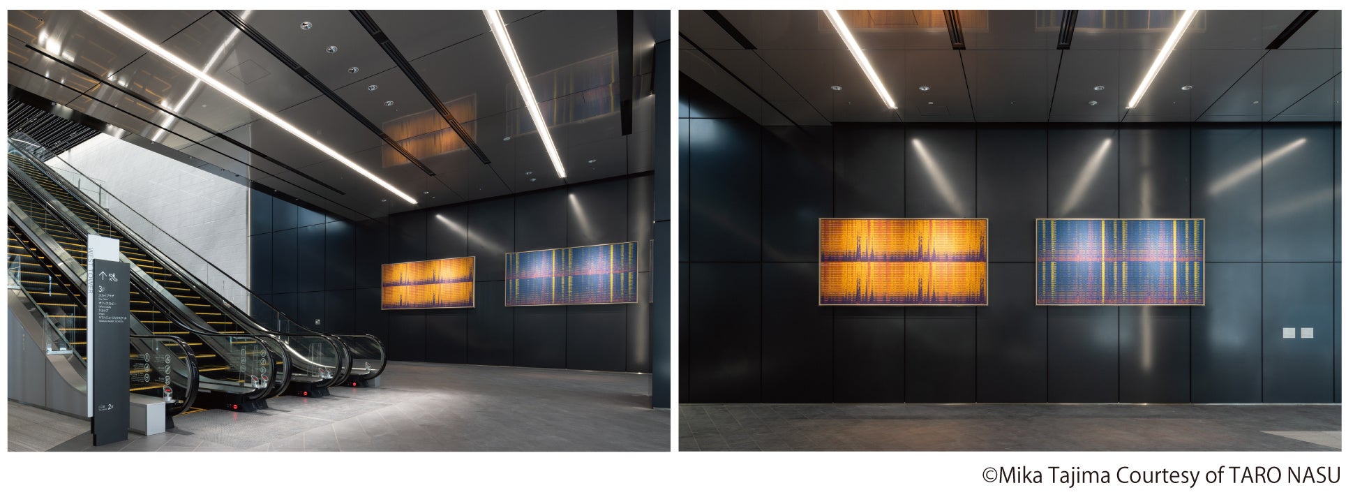 ウエストタワーの2 階アトリウムに設置されている本作品は、2022 年10 月7 日に録音した横浜シンフォステージ新築工事の作業音等の音源をもとに制作されています。横浜シンフォステージが造られていく過程の視覚化、またそこで働く人間の活動の記録でもある本作品は、横浜シンフォステージ そのものの「肖像画」とも言える作品です。