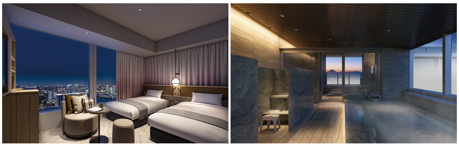 本ホテルロビーは、26 階(地上約 130m)に位置し、空に浮かぶ寛ぎの空間を演出します。全 150 室の客室は 27 階以上の高層階にあり、すべての客室からみなとみらいの開放的な景色を望むことができます。客室は、「ダブル」「ツイン」「ユニバーサル」に加え、最大4名まで利用可能な2段ベッドのある「フォース」を導入し、ゲストのさまざまな利用用途に対応できる構成となっています。また、「京急 EX ホテル」ブランドでは初の大浴場・露天風呂を設け、天気の良い日は富士山を見ながら入浴することができます。ビジネスだけでなくレジャー利用にも対応できる「京急 EX ホテル」として、多様化する宿泊ニーズに応えていきます。
