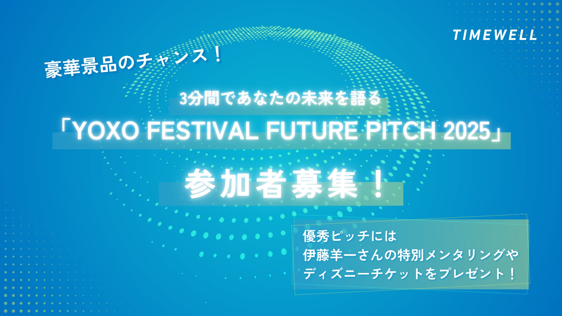 株式会社TIMEWELL(本社:神奈川県横浜市、代表取締役:濱本隆太、以下TIMEWELL)は、次世代のビジネスリーダーやイノベーターによる新たなビジョンやアイデアを発表する「YOXO FESTIVAL FUTURE PITCH 2025」の参加者募集を開始いたします。「未来への挑戦」をテーマに革新的なアイデアや情熱的なビジョンを3分間のピッチで共有していただきます。あなたの想いを発表してみませんか?