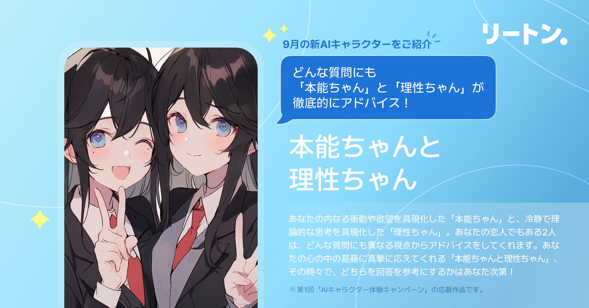 7月に開催した「第1回AIキャラクター体験キャンペーン」にてお客様から投稿いただいた数々の魅力的なAIキャラクターの中から、「倫理さん(Xユーザー名)」の作成したキャラクターを公式AIキャラとして採用することに決定しました。お客様投稿のAIキャラクターを公式に起用するのは、リートン国内では初の試みです。
