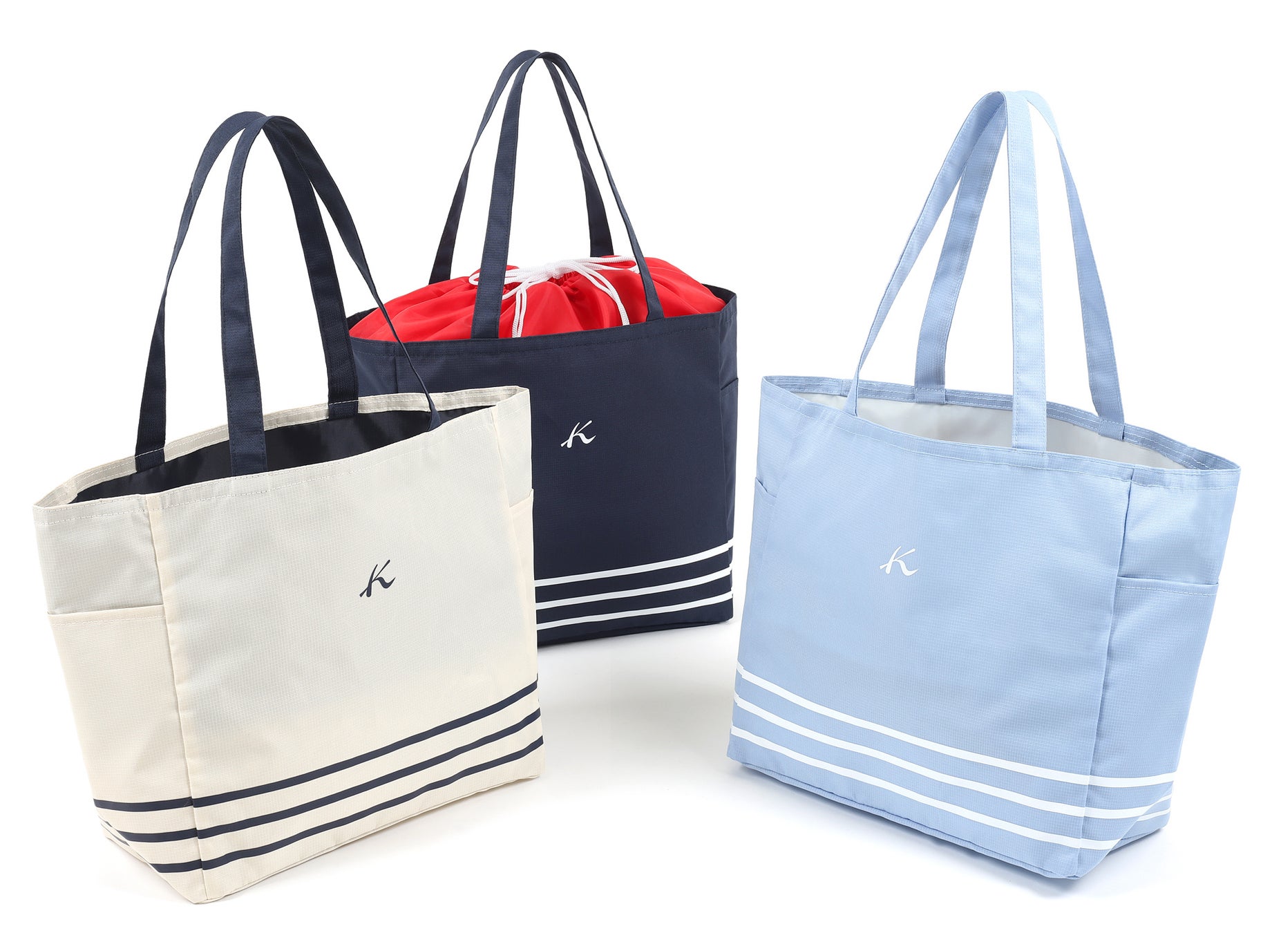 第5弾となる今回のコラボレーションマイバッグは、横浜らしいマリンテイストなボーダーがポイント。口元は中身が見えず安心な巾着仕様で、両サイドには便利なポケット付き。 マチが広く、収納力の高さも魅力です。内ポケットには、横浜市資源循環局マスコット イーオ・ミーオ×キタムラのオリジナルラベルをあしらいました。