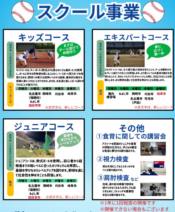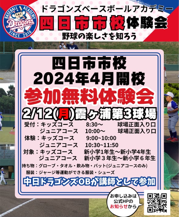 開校に先立ちまして、無料体験会を2月12日に四日市市霞ヶ浦第3球場(三重県四日市市羽津甲5169番地)で開催します。キッズとジュニアの2コースあり、講師は中日ドラゴンズOBが務めます。キッズは午前9時から、ジュニアは午前10時半から。小雨決行、荒天中止です。