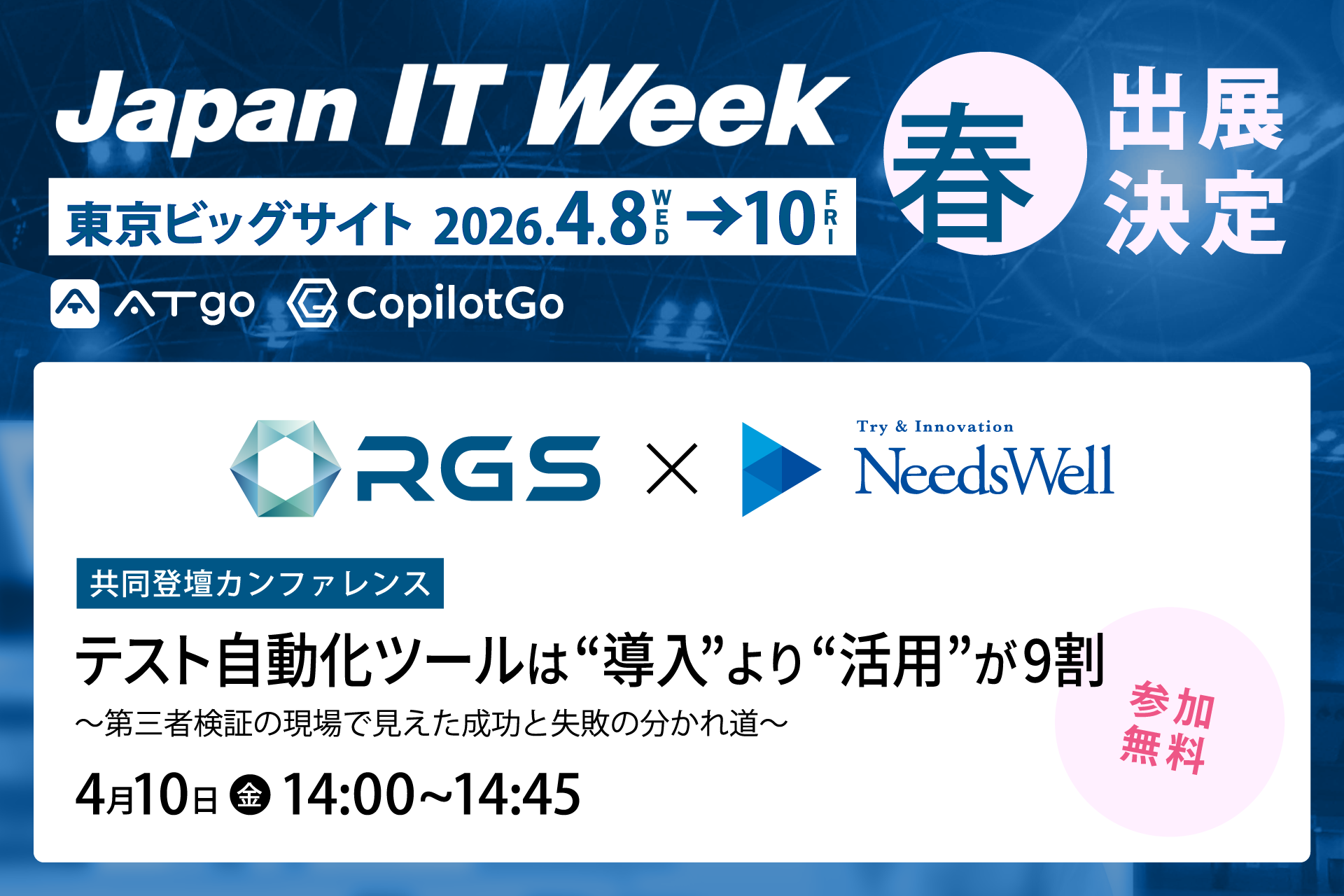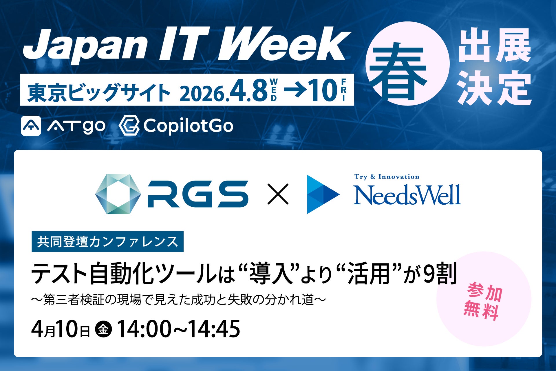 RGS株式会社(本社:神奈川県横浜市、代表取締役社長:余澤洋平)は、2026年4月10日(金)に開催される展示会「Japan IT Week【春】2026」内のカンファレンスに、株式会社ニーズウェル(本社:東京都千代田区、代表取締役社長:松岡元)と共同登壇しますのでお知らせします。