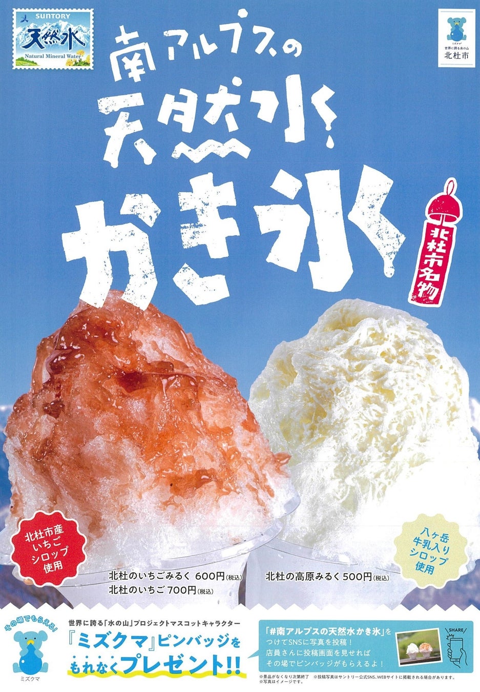 ~サントリー天然水で製氷したかき氷にオリジナルシロップ「北杜のいちご」「北杜のいちごみるく」「北杜の高原みるく」の3種類、酒蔵「七賢」では糀限定コラボ商品を~ 期間:市内5店舗にて7月13日(土)から