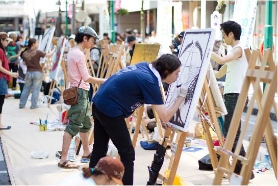 駅前通りの歩行者天国で音楽に合わせ、30人のアーティストが30号のキャンバスに思い思いの表現で絵を仕上げていきます。