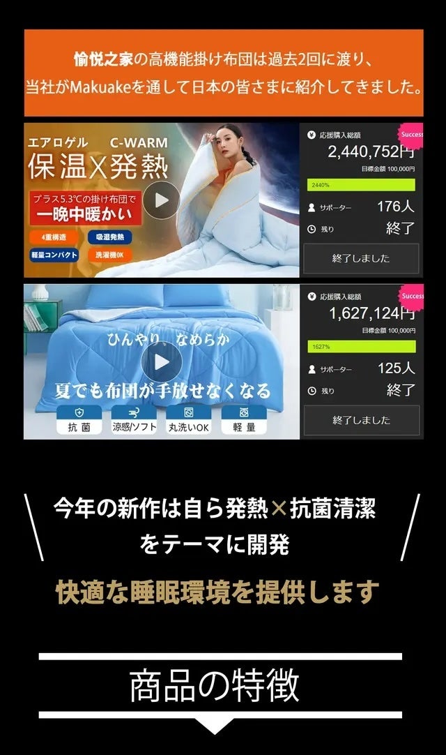 今年の冬は「人が被ると自然に発熱、薄くて軽くて清潔な冬用布団」をお届けします。