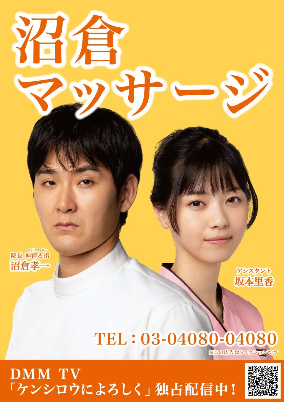 松田龍平・西野七瀬が渋谷のあなたをアタタタタッ!DMM TV「ケンシロウによろしく」に登場する沼倉マッサージが店舗広告風ビジュアルで10月1日(日)より渋谷をジャック!