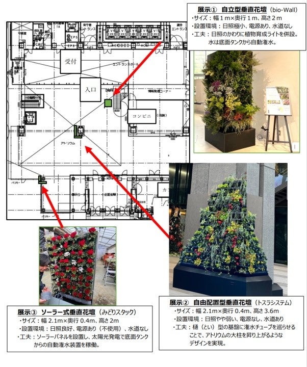 壁面緑化は、我が国では、設置条件の違いや現場のニーズにきめ細やかに対応した多様な手法が開発されてきました。今回の『Vertical Garden』では、我が国の壁面緑化技術の代表的なものの中から、自立型、自由配置型、ソーラーパネルつきカセット型という異なるタイプの壁面緑化技術で、本物のみどりを育てていきます。