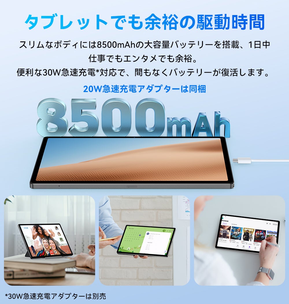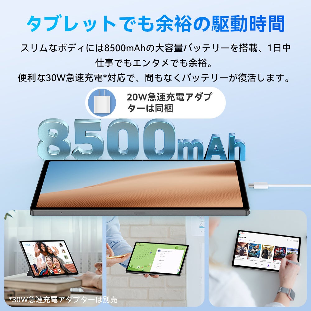 Hpad5は、最大8500mAhの高容量バッテリーを備えており、十分なパワーを提供します。実際のテストでは、1080Pのビデオを連続再生することができ、最大12時間の使用が可能であり、バッテリー切れの心配なく日常の仕事やエンターテイメントを楽しむことができます。Type-C 30Wの高速充電とOTGをサポートしており、素早くバッテリーを充電することができます。バッテリーのサイクル数が高く、一般のバッテリーよりも劣化に対して耐性があり、安全性も優れています。