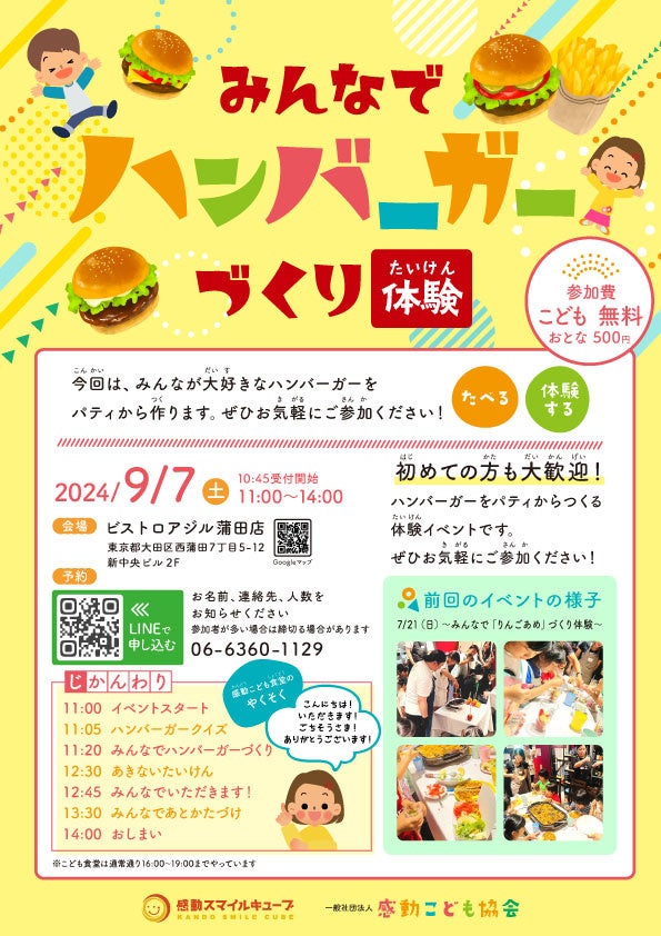 一般社団法人 感動こども協会(所在地:東京都新宿区、以下、当協会)の正会員である感動こども食堂「ビストロアジル 蒲田店」にて、2024年9月7日(土曜日)にイベント『みんなでハンバーガーづくりたいけん 』を開催します。