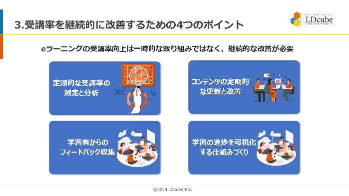 ・受講率が低下してしまう原因を理解する ・受講率を向上させるためのポイントを学習する ・すぐに使える具体的な取り組み施策を得る |