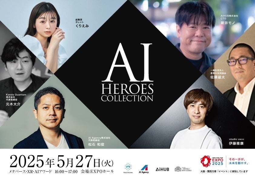 AIの最先端が集結する新たな祭典「アイコレ(AI Heroes Collection)」が始動します。株式会社Meta Heroes、AI Agency株式会社、AIHUB、一般社団法人教育AI活用協会の共催により、2025年5月27日・28日の2日間、大阪・関西万博 EXPOホール(27日は「メタバース(XR)/AIアワード」、28日は「防災万博」)にて初開催されます。イベント内では、実力派AI企業による発表や、生成AI分野を牽引する著名人が登壇する特別セッションを予定しています。 さらに、“セルフプロデュースの天才”として知られるSNS総フォロワー130万人超のインフルエンサー/アーティスト・くりえみ氏(AIHUB)も出演決定。AIと創造性の融合が生む、新たなムーブメントにぜひご注目ください。(※詳細は後日発表します)