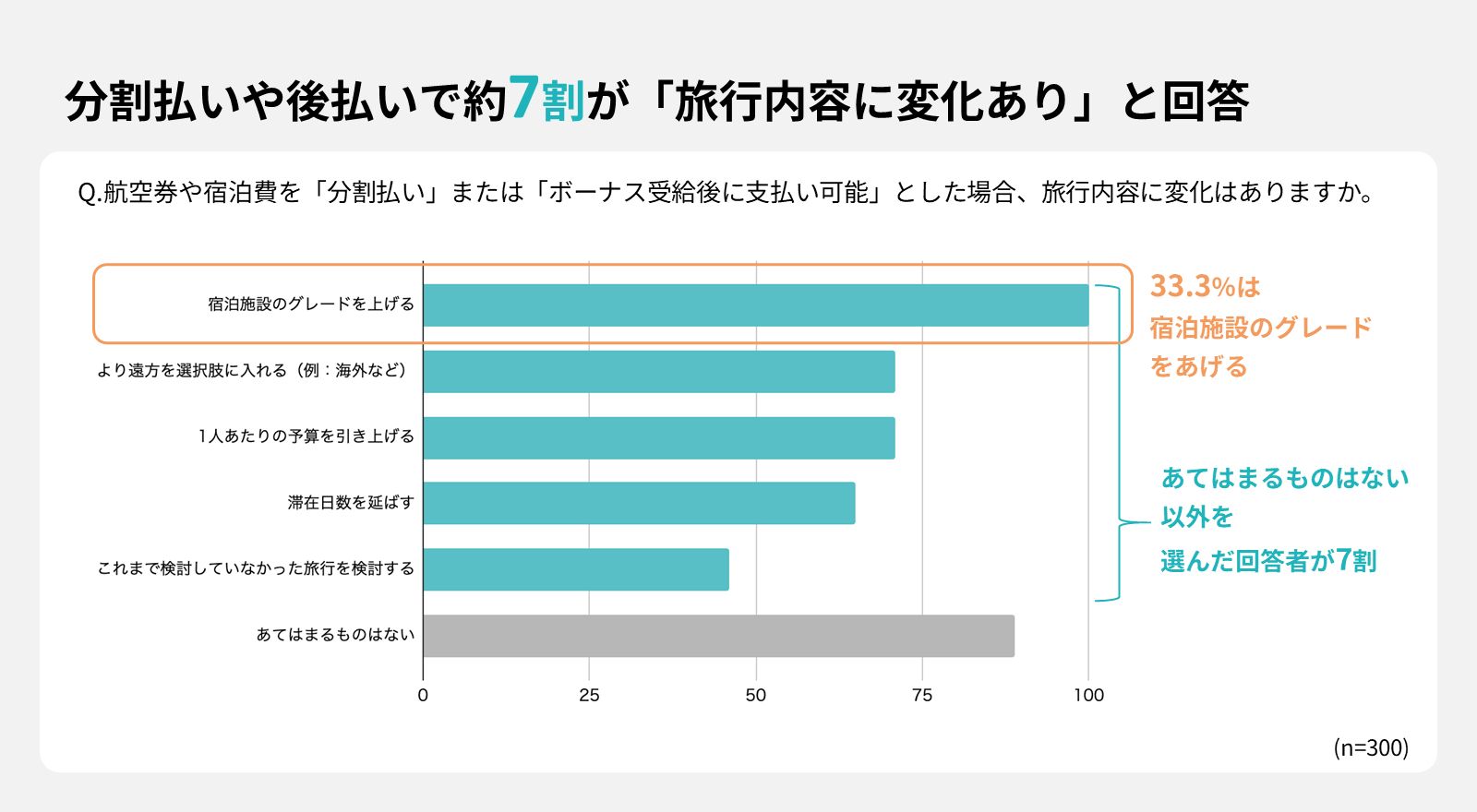 ・分割払いや後払いが可能な場合、約7割が旅行内容が変化すると回答。中でも33.3%が「宿泊施設のグレードを上げる」と回答