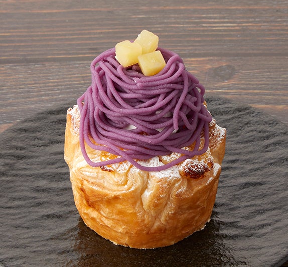 色鮮やかな紫色の『Apple Cup紫芋モンブラン』は、ジューシーなりんごと、ほろほろと口どけるパイ生地、モンブラン仕立てのやさしい甘みの紫芋クリームが織りなす絶妙なマリアージュをお楽しみいただけます。