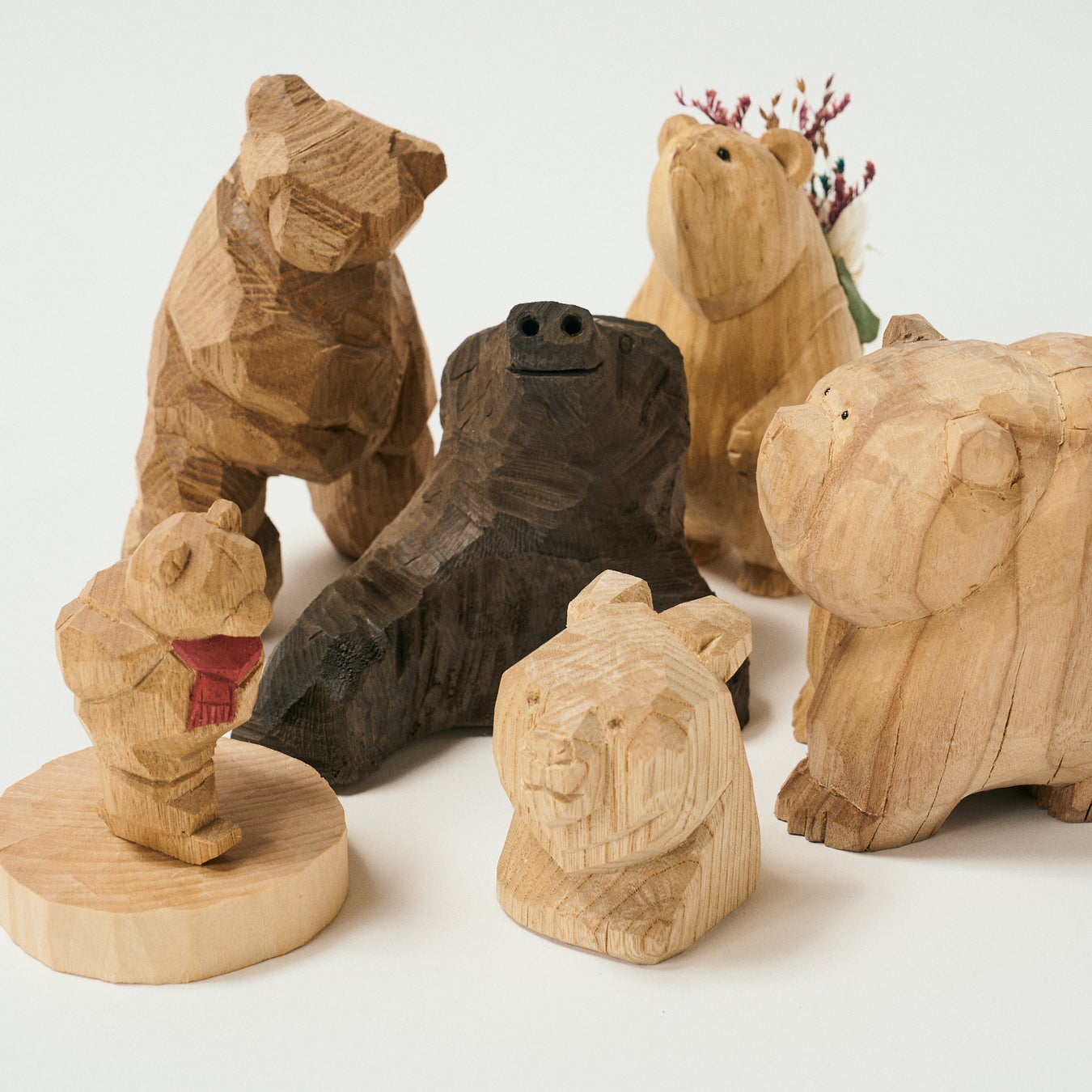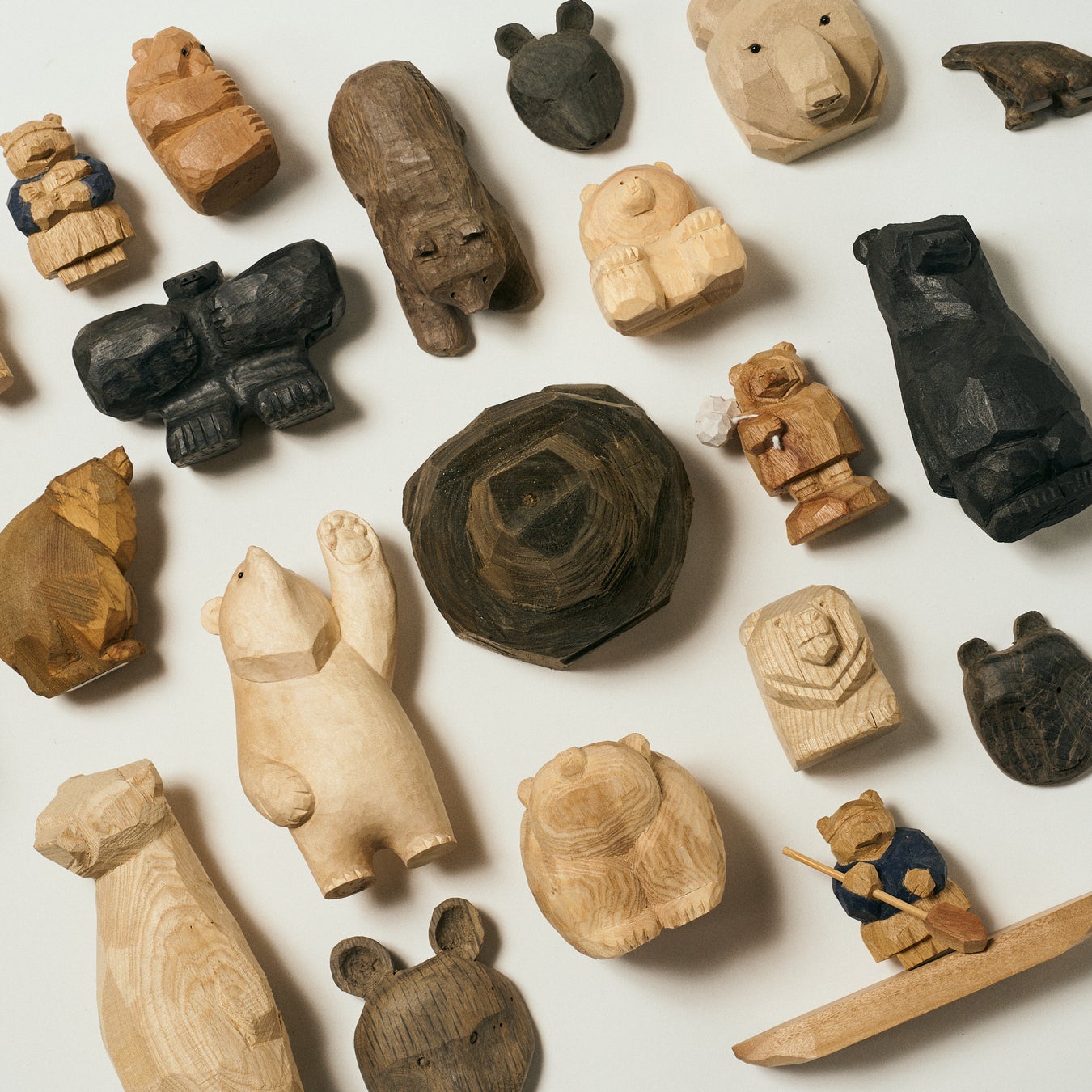 作風にはそれぞれ個性があり、力強い表情をした熊やほっこりするような可愛らしい熊など沢山の熊が並びます。一つ一つの表情の違い、材の違いを手に取り触れてみて、木彫り熊の世界をお楽しみください。