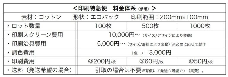 素材やその形状、印刷サイズによって料金は変化しますので、あくまで参考価格にはなりますが、以下にコットン製のエコバッグに一般的な20cm x 10cm程度の印刷を施す場合の料金をご紹介しておきます。