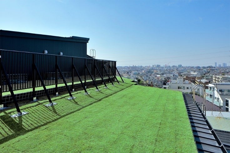 ・共有部には天然木を使用し森の中に入り込むような空間をデザインした他、屋上には天然芝の「草屋根テラス」を実現。