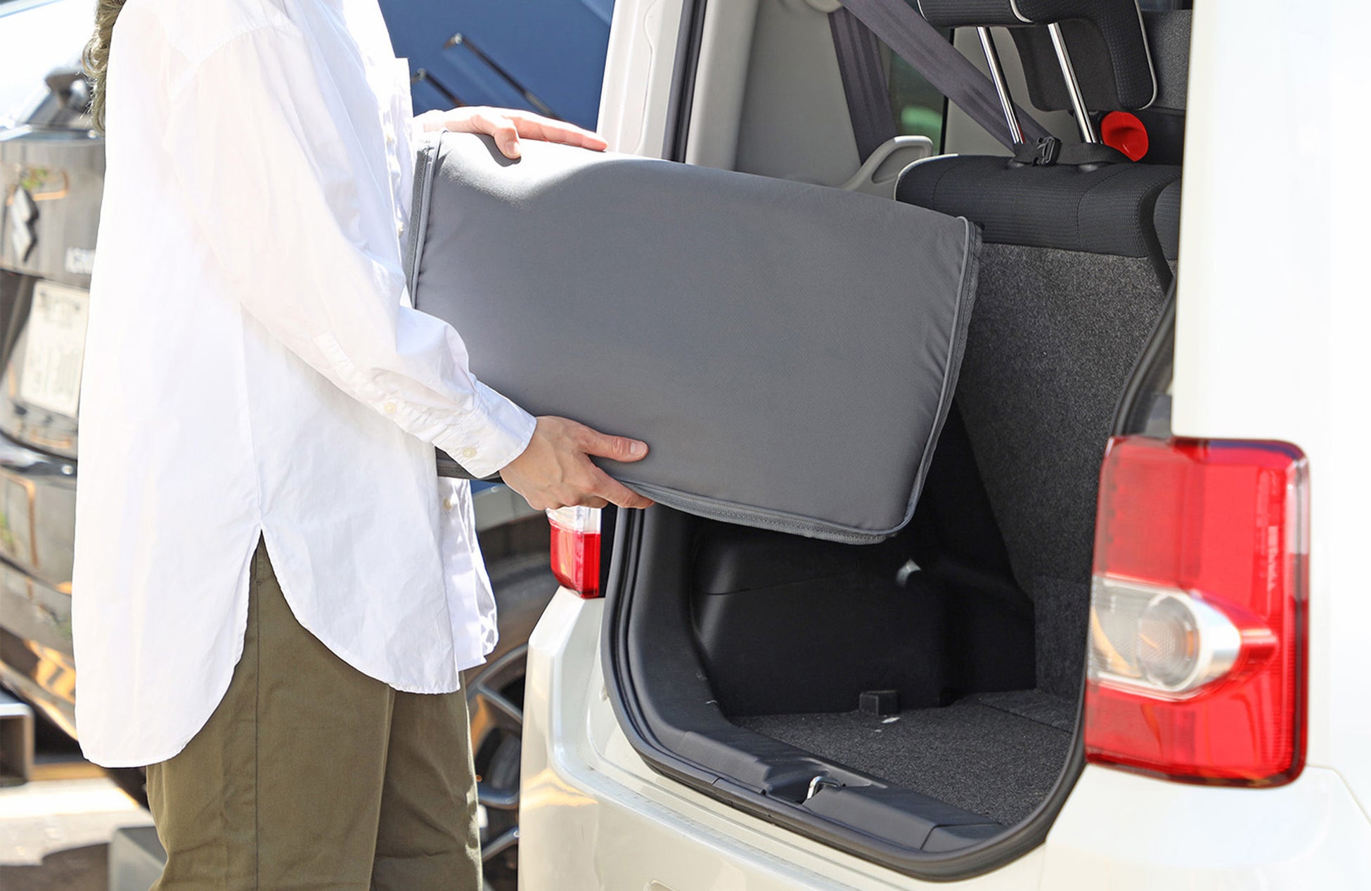 使わない時は薄く折りたたみ、キッチンの隙間や車のシート下など、すぐに取り出せる所にしまっておけます。
