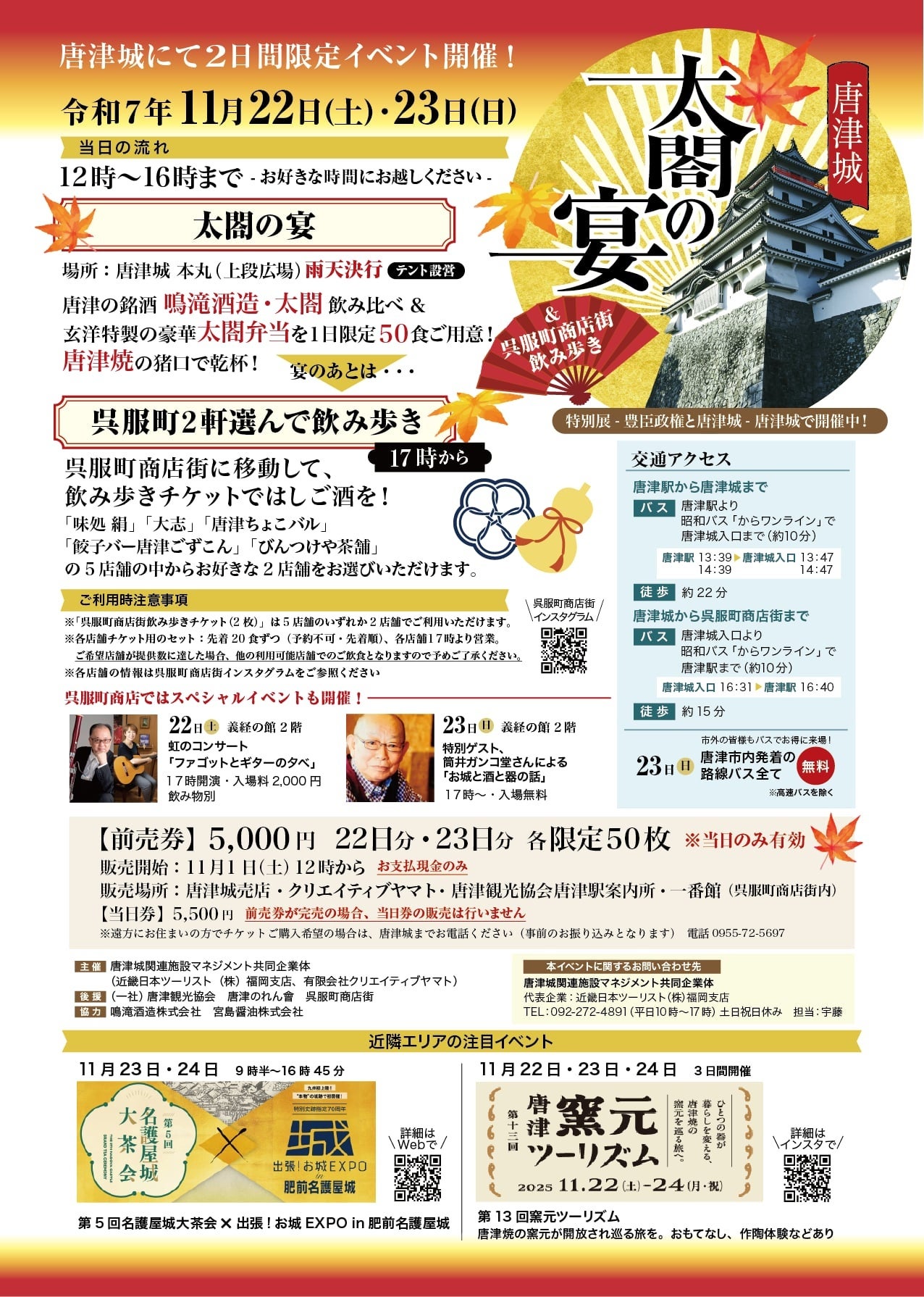 秋の唐津を彩る特別イベント「太閤の宴」が、唐津城を舞台に2日間限定で開催されます。名城・唐津城本丸では、地元の銘酒「鳴滝酒造 太閤」の飲み比べや、和食料理「玄洋」