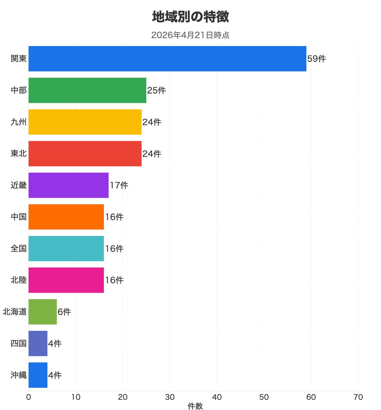 当週は関東に約3割が集中し、中部・九州・東北が同規模で並ぶ構成です。