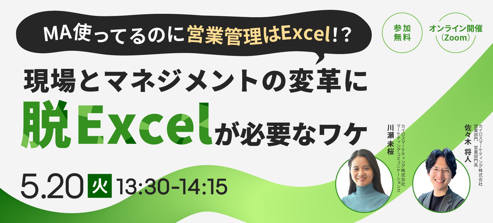 “次の一手“がデータでわかるMA+SFA一体型ツール「Kairos3(カイロススリー)」を提供するカイロスマーケティング株式会社(本社:東京都渋谷区、代表取締役:佐宗 大介、以下「当社」)は、オンラインセミナー「MA使ってるのに営業管理はExcel!?現場とマネジメントの変革に脱Excelが必要なワケ」を2025年5月20日(火)に開催いたします。