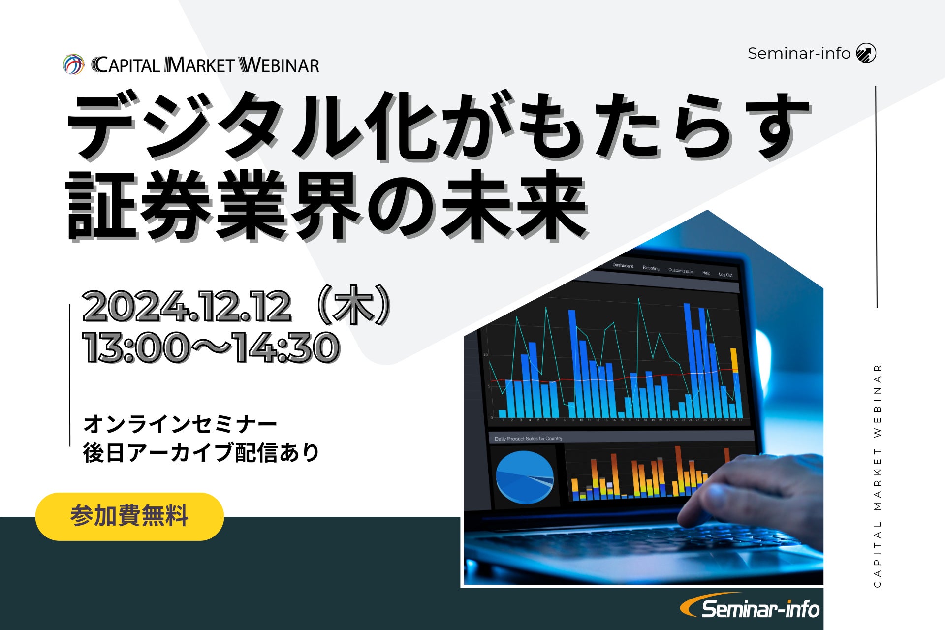 株式会社セミナーインフォ(本社:東京都千代田区 代表:小西 亘)は、2024年12月12日(木)にCAPITAL MARKET WEBINAR「デジタル化がもたらす証券業界の未来」を開催いたします。