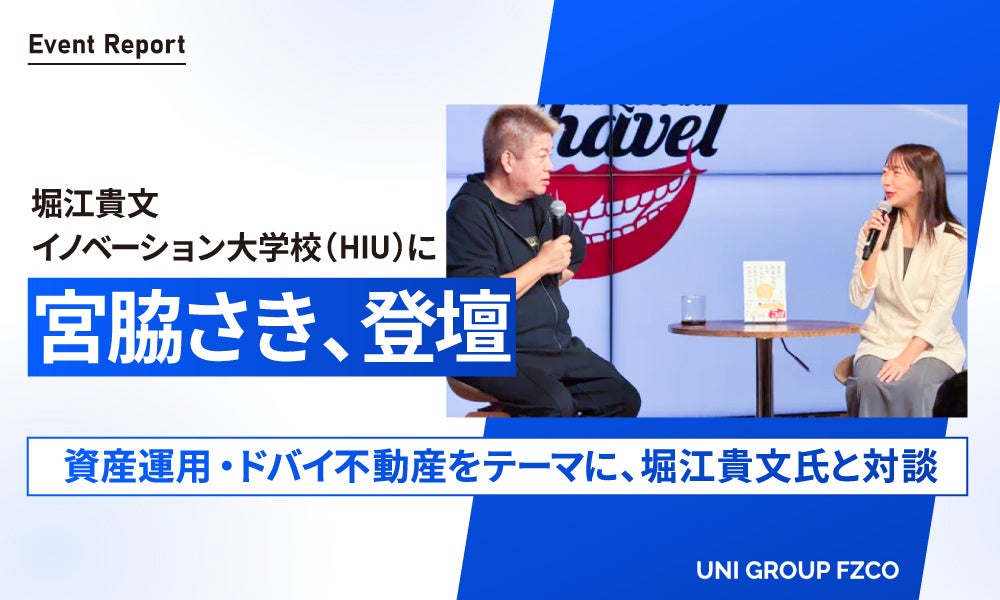富裕層向け資産コンサルティングおよび海外移住支援を手がける UNI GROUP FZCO(本社:Dubai, United Arab Emirates、代表:宮脇さき)は、資産運用の専門家・宮脇さきが、実業家・堀江貴文氏が主宰する会員制サロン「堀江貴文イノベーション大学校(HIU)」にゲスト登壇し、対談形式のトークイベントに出演したことをお知らせいたします。