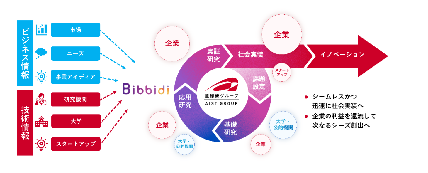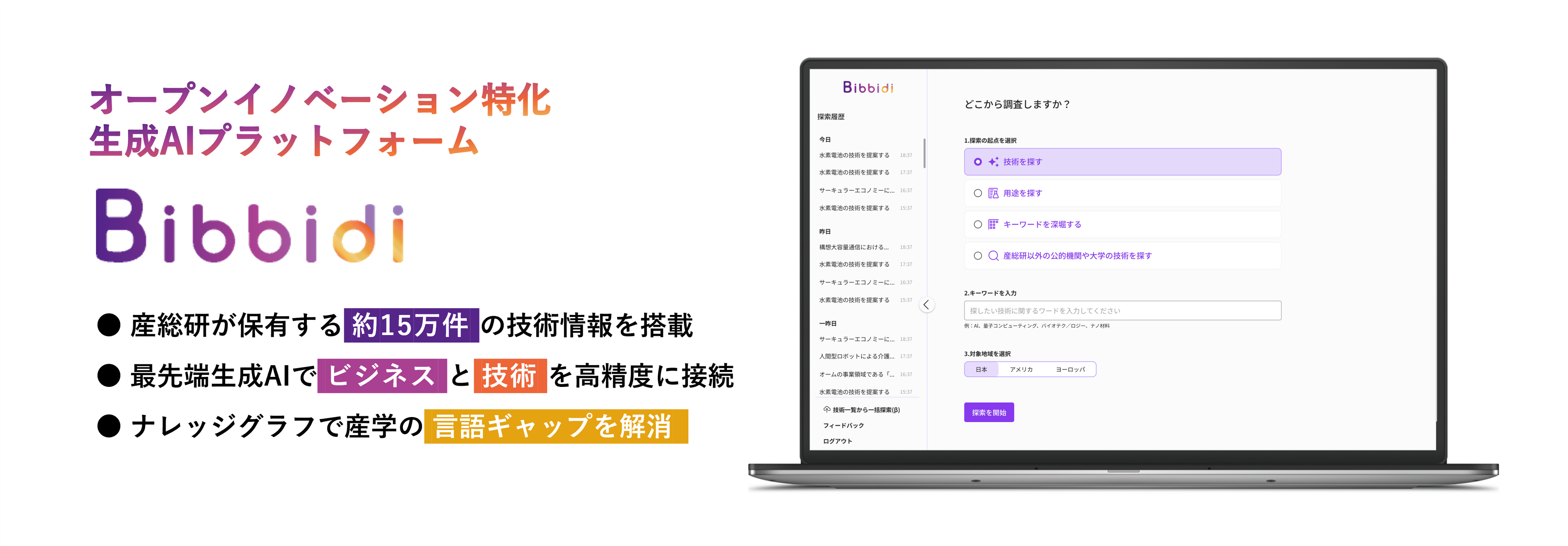 「Bibbidi」は、産総研が保有する約15万件の膨大な技術情報(シーズ)を核に、企業の事業課題/市場課題などの情報(ニーズ)と結びつけることで、産学連携によるオープンイノベーション創出を加速する生成AIプラットフォームです。