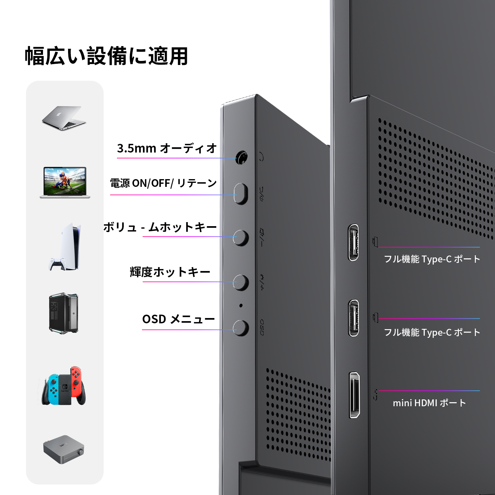 HDMI端子も搭載しているため、Type-C非対応の機器でも接続可能。PS5/PS4やNintendo Switchなどのゲーム機に接続すれば、自宅や旅行先で手軽に大画面ゲームを楽しめます。スマートフォンと接続して動画視聴用のサブモニターとして使うこともでき、一台持っているだけで様々なシーンで活躍します。