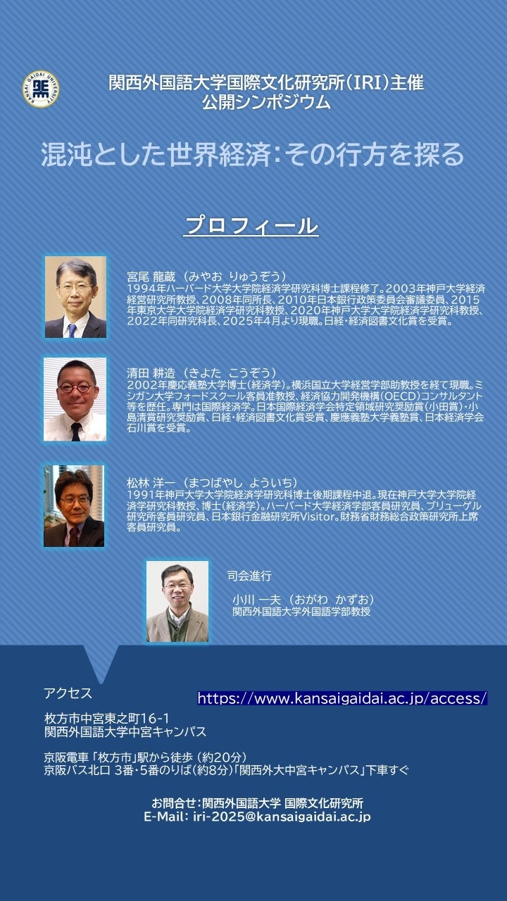 関西外国語大学 国際文化研究所(IRI)は、2026年2月7日(土)公開シンポジウム「混沌とした世界経済:その行方を探る」を開催します。